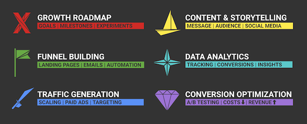 Während seiner mehrjährigen Erfahrung mit Meetups rund um das Thema Marketing, haben sich für Bens Curriculum sechs Kernelemente herauskristallisiert, die für effektives Growth Marketing sorgen. „Diese 6 Themenbereiche sind die Bausteine, deren Basics du in drei Monaten lernen kannst, aber auch nach drei Jahren noch unglaublich viel dazuzulernen hast.“