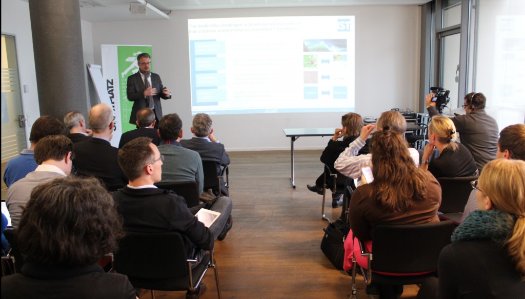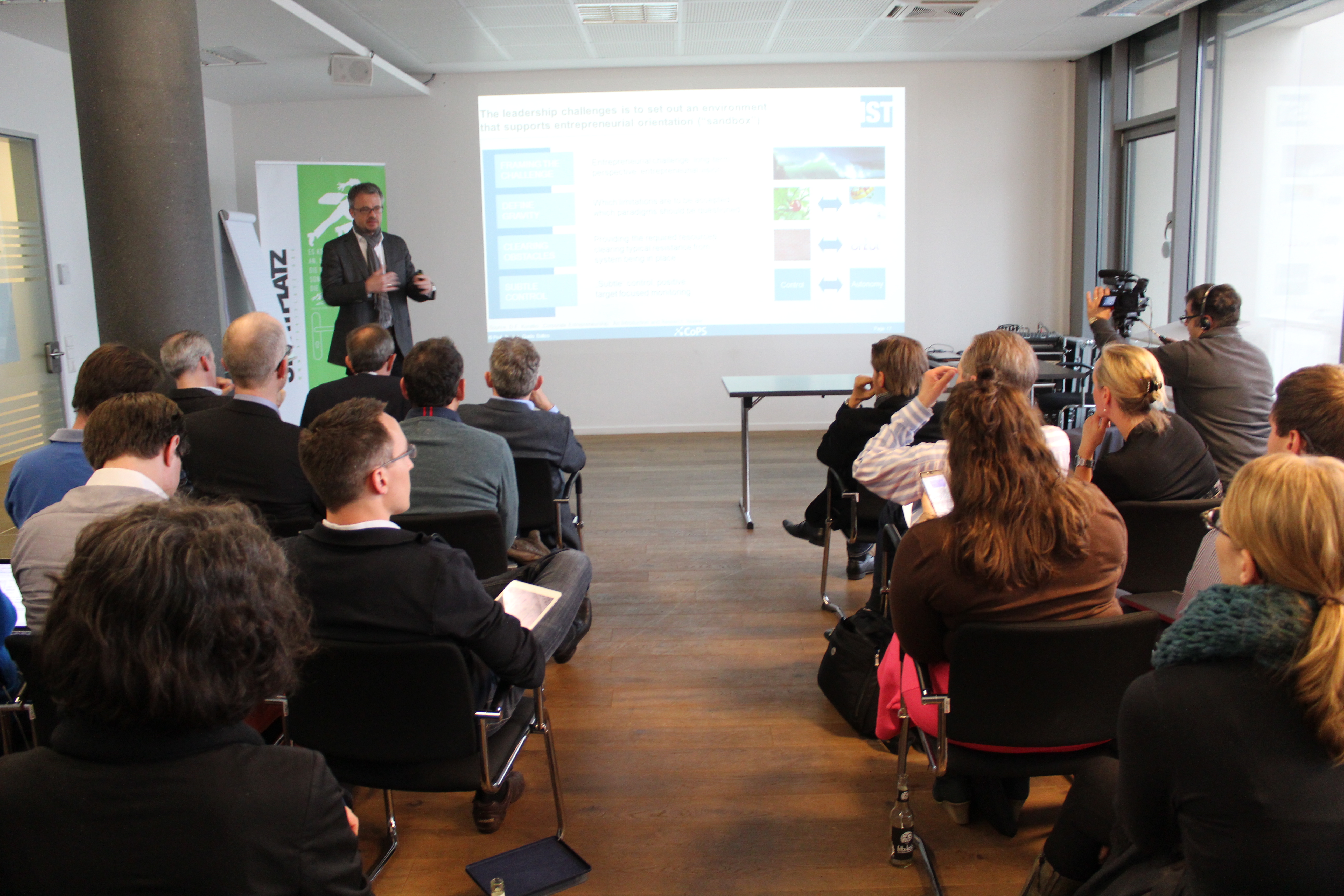 Der Vortrag konzentrierte sich unter anderem auf die Fragestellungen der Organisationsgestaltung für die Implementierung von Ambidextrie und Entrepreneur Orientierung – sprich die Fähigkeit einer Organisation gleichzeitig effizient und flexibel zu sein, um nicht zuletzt einen Wettbewerbsvorteil daraus ziehen zu können. Bei dem Thema Innovation ginge es vor allem um eines: den Mut zum Ausprobieren. Ohne die Planung und Implementierung außer Acht zu lassen, sollten Organisationen gerne auch mal vorherrschende Zustände hinterfragen und auf den Kopf stellen, selbst wenn sie daran scheitern. Denn disruptive Modelle gehören zum Innovationsprozess dazu und treiben diesen voran.