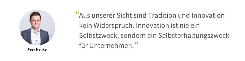 Peer Henke: Aus unserer Sicht sind Tradition und Innovation kein Widerspruch. Es ist immer gut zu wissen, wo man herkommt und was man in der Vergangenheit schon alles geschafft hat. Wir nehmen aber oft wahr, dass Traditionsbewusstsein als bremsende Kraft dargestellt wird. Für uns ist es wichtig, Respekt und Verständnis gegenüber den Dingen aufzubringen, die historisch gewachsen sind. Zudem sind Organisationen immer heterogene Gebilde. Das heißt, die Innovationskraft einzelner Bereiche ist immer unterschiedlich ausgeprägt. Und unsere Erwartungshaltung darf dementsprechend nicht sein, dass immer alle sofort hundertprozentig überzeugt von allem sind. Damit Strukturen und Prozesse später aber auch skalierbar sind, muss man dem Individualisierungswunsch und den Gewohnheiten der Fachbereiche auch manchmal mit einer gewissen Bestimmtheit entgegentreten. Wir als Treiber müssen uns also darüber bewusst sein, dass vermeintlich kleine Schritte aus Innovationssicht oft schon ziemlich große Schritte für tradierte Unternehmen sind. Für uns ist es daher die Hauptaufgabe, den Überblick über diese vielen kleinen Strohfeuer zu behalten, damit man die Balance zwischen Unterforderung und Überforderung der Organisation halten kann. Letzten Endes hängt es dann eben auch davon ab, wie viel Überforderung man zeitweise einer Organisation zumuten kann. Das hängt auch davon ab, wie hoch der Veränderungsdruck von außen ist. Wir vier empfehlen deshalb auch stabilen Unternehmen, über den Tellerrand zu schauen, damit man später eben nicht in Zugzwang gerät. Voraussetzung für rechtzeitige Anpassungen sind die Erkenntnis und die Unterstützung durch gewisse Schlüsselpersonen oder Unternehmensbereiche. Grundsätzlich muss also festgehalten werden: Innovation ist nie ein Selbstzweck, sondern ein Selbsterhaltungszweck für Unternehmen. Es funktioniert allerdings nur, wenn die Menschen auch echte Mehrwerte erkennen. Und das passiert auch in traditionsbewussten Unternehmen.