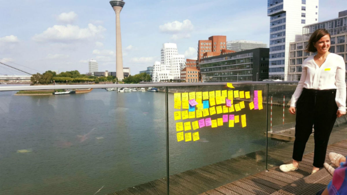 Nach der spannenden Vorstellung der Startups, einem Einblick in die Lean Startup-Methode und einem großen Schluck Kaffee übernahmen Yannis und Jan von Protostart die Einführung in die Design Thinking Thematik. Das Ziel: Neue Wege aufzeigen, wie Wissenschaftler ihr Knowhow mit den Bedürfnissen des Marktes verbinden können. Die Naturwissenschaftler nahmen die Fragestellung des Tages mit voller Motivation auf: Wie können wir Großstädtern ohne grünen Daumen mehr „Grün“ in ihr Leben bringen? Hier muss erst einmal die technische Ebene verlassen werden: Wer Bedürfnisse von Nutzern befriedigen will, muss diese erst einmal erkennen. Raus ging es also in den Düsseldorfer Medienhafen – Eine tolle Kulisse für Interviews mit vielen spannenden Menschen.