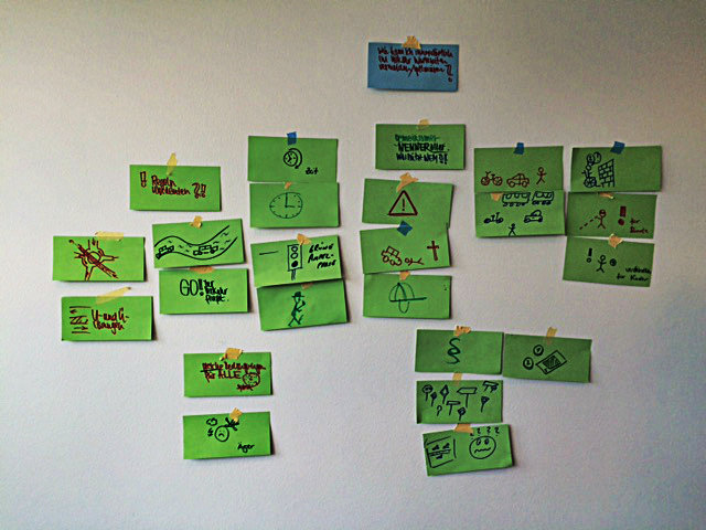 Im Anschluss wurden Problematiken formuliert und visualisiert, an der es sich aus Sicht der Teilnehmer zu arbeiten lohnt. Alle relevanten Aspekte, die den Teilnehmern dabei durch den Kopf schossen, wurden dabei aufgenommen. Ziel war es ein Gruppenverständnis zu schaffen und die Rahmenbedingungen abzustecken.