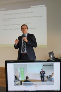 Prof. Hendrik Speck lieferte in seinem Vortrag viele interessante Aspekte in Bezug auf Datenschutz. Seiner Meinung nach helfen Stoppschilder im Netz nicht. Jeder ist selbst dafür verantwortlich, wie viel er von sich preisgibt und welche Dienste er dafür nutzt. Medienkompetenz gibt es nicht als Schluckimpfung.