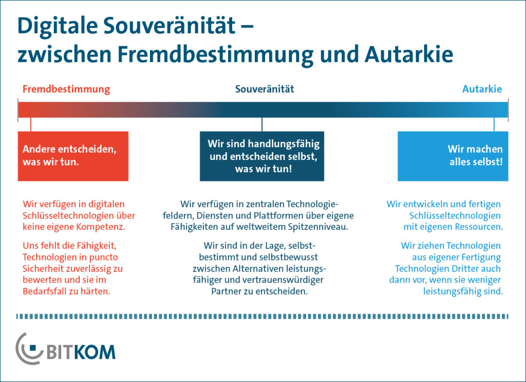 Die aktuelle Studie des BITKOM-Verbandes zeigt, dass Deutschland unbedingt digital souverän werden muss, um sich im internationalen Wettbewerb zu behaupten und zukünftigen Wohlstand und gesellschaftliche Entwicklung zu sichern. Leider ist Deutschland nach Aussagen der BITKOM bei dieser Entwicklung nicht vorne mit dabei.