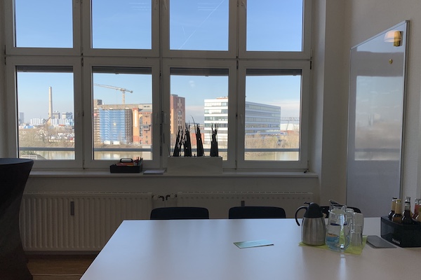 Bright conference room with a view of the Media Harbor for workshops and meetings.