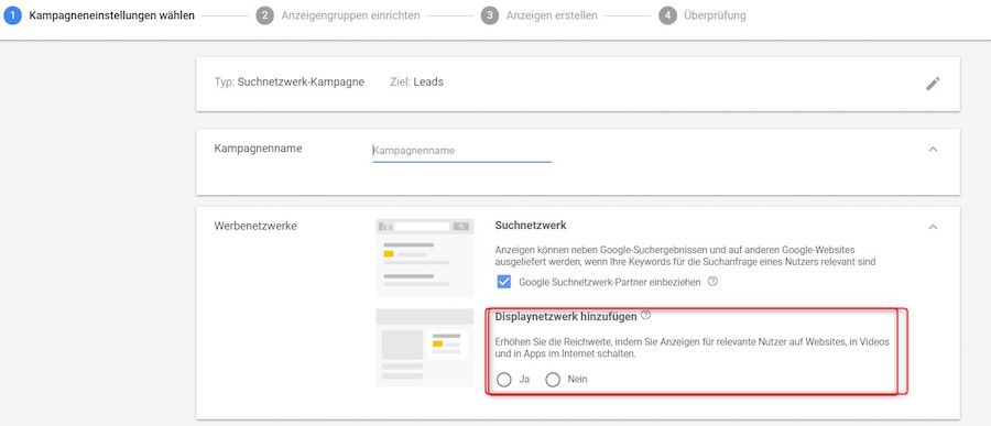 Google bietet die Möglichkeit, Kampagnen in der Suche und in dem Display-Netzwerk (d.h. als Werbeanzeigen bzw. Banner auf einer Webseite) anzuzeigen. Im Rahmen der Kampagnen-Erstellung hast du die Möglichkeit, bei einer Suchkampagne mit einem Klick auch das Display Netzwerk zu aktivieren. Das solltest du aber auf keinen Fall tun!