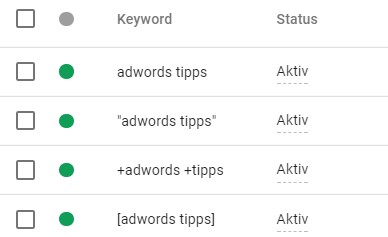 Bei der Auswahl der Keywords (die Wörter, unter denen bei der Suche dann eure Werbung eingeblendet wird) gibt es verschiedene Optionen von Match Typen. Hier ein Auszug aus einem Google Ads Konto: