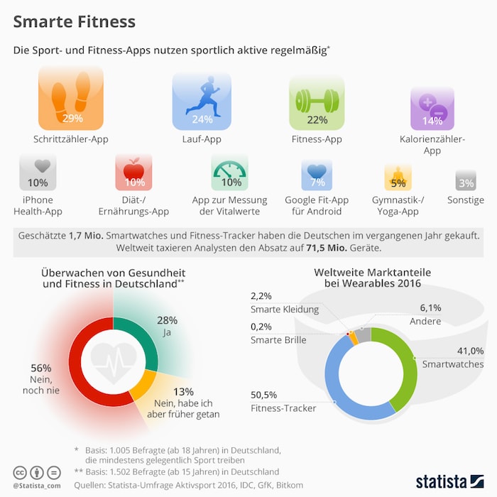 Welchen Einfluss Smarte Fitness auf seine Nutzer hat, zeigt darüber hinaus eine Infografik von Statista: Im weltweiten Vergleich der Marktanteile für Wearables beanspruchen Fitness-Tracker mit 50,5 % und Smartwatches mit 41 % das größte Stück des Kuchens für sich. Rund 1,7 Mio. Smartwatches und Fitness Tracker wurden von den Deutschen im vergangenen Jahr erworben. 29 % der Befragten gaben an, regelmäßig eine Schrittzähler-App zu benutzen, dicht gefolgt von Lauf-Apps mit 24 % und Fitness-Apps mit 22 %.
