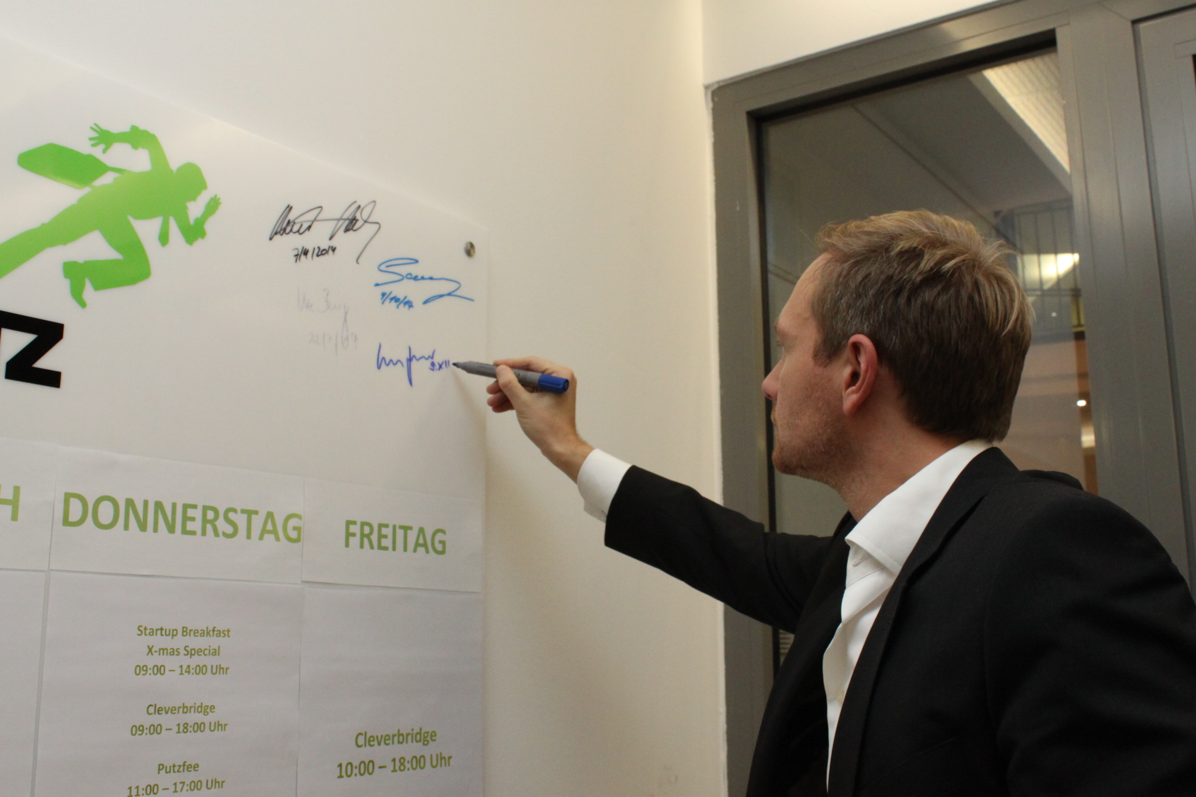 Nach einigen interessierten Fragen aus dem Publikum wurde die Diskussion schließlich beendet. Man widmete sich nun dem Networking zwischen Politikern und Gründern. Christian Lindner unterzeichnete auf unserer „Wall of STARTPLATZ“ und rundete so einen interessanten und anregenden Abend ab.