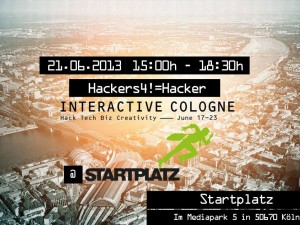 Workshop „Hackers for Non-Hackers (Hackers4!=Hackers)“ – 15:00 bis 18:30 Uhr. Die Referenten Liane Thönnes, Lars Brillert, Jan Kus, Stephan Pavlovic & Tim Schneider geben „Nicht-Hackern“ einen Einblick in die Welt von Web und Technologie. Der Workshop findet im Rahmen des Interactive Cologne Festivals statt. Die Teilnahme an der Veranstaltung ist kostenlos.