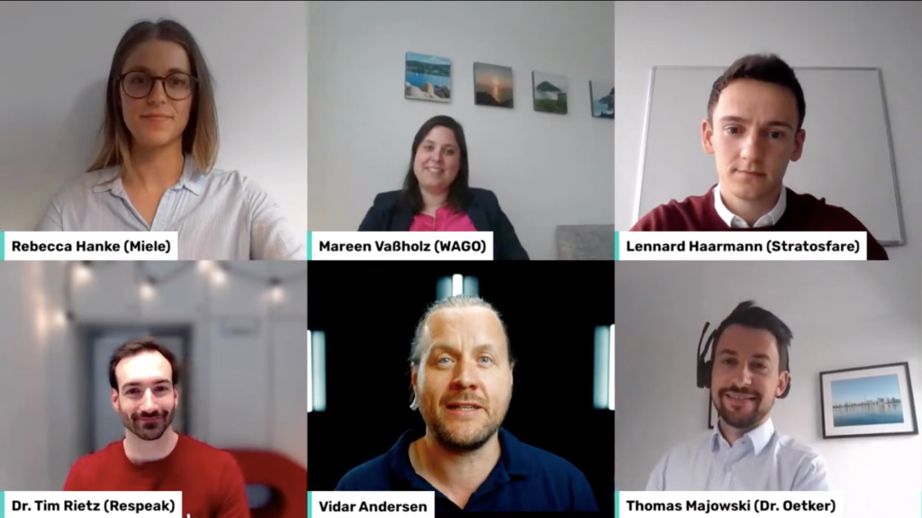 Beim Rheinland-Pitch war die Initiative durch Projektmanager Lennard Haarmann vertreten. Für Haushalts- und Gewerbegeräte-Hersteller Miele dürften wir Rebecca Hanke, Technology Scout, auf der Bühne begrüßen. Mareen Vaßholz, zuständig für Unternehmensstrategie und die digitale Transformation bei WAGO, repräsentierte den Verbindungstechnik-Experten. Das Nahrungsmittelunternehmen Dr. Oetker schickte Senior Consultant & Cluster Lead „Manufacturing Excellence“ zum großen Rheinland-Pitch. Die ExpertInnen und gleichzeitig RepräsentantInnen der Unternehmen konnten die Startups nach ihren Pitches direkt mit Fragen löchern & damit auf ihre Eignung für eine Zusammenarbeit prüfen.