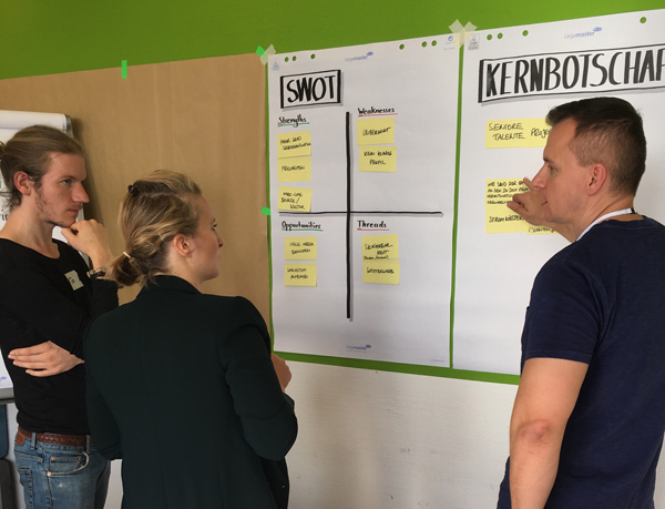 SWOT, Personas und die Kernbotschaft werden analysiert und die wichtigsten Aussagen werden aufgeschriebenDie wichtigsten Fakten stehen sich gegenüber für die Story des Recruitment Games