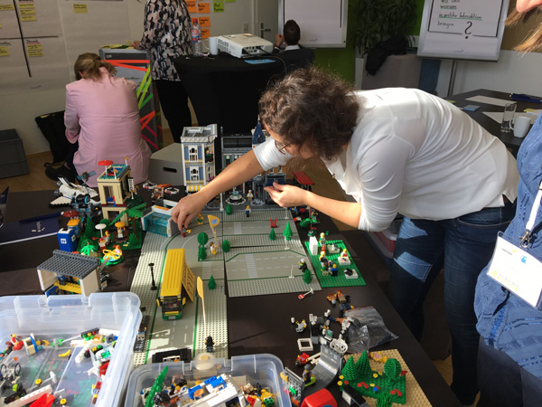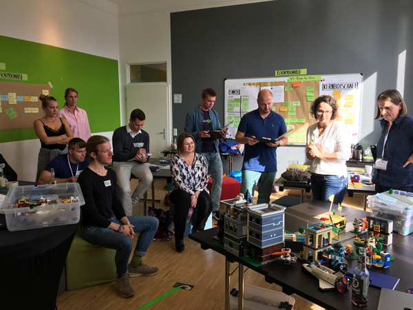 Zuerst wurde die Methode erklärt, wie die Recruitment Games erstellt werden. Die Teilnehmerinnen und Teilnehmer haben sich in 2er Teams aufgeteilt und auf ein Unternehmen geeinigt für das sie ein Konzept erstellen wollen. Für das Konzept haben sie mit Hilfe von verschieden Methoden, zum Beispiel der Swot Analyse und der Persona-Technik, ein Szenario geschaffen, das die Geschichte von einer potenziellen Angestellten oder einem potenziellen Angestellten erzählt. Es beschreibt, wie er oder sie auf das Recruitment Game stößt und so zum Unternehmen gelangt oder eine Einladung bekommt das Unternehmen kennen zu lernen. Unsere Teilnehmer konnten das Szenario mit Lego nachbauen um sich besser in die Geschichte und die Person hineinzuversetzen.