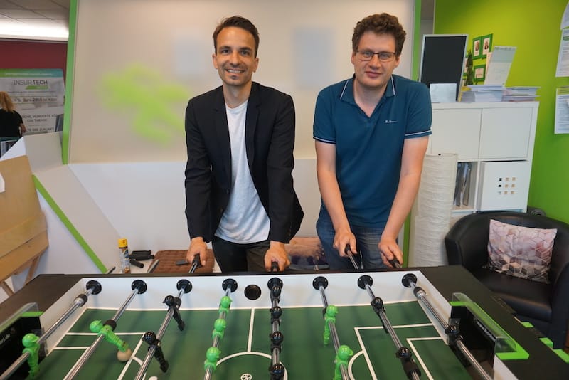 Adrian Hotz (links) und Dominik Bors (rechts) bei einer Kicker-Session im STARTPLATZNetworking is like planting seeds