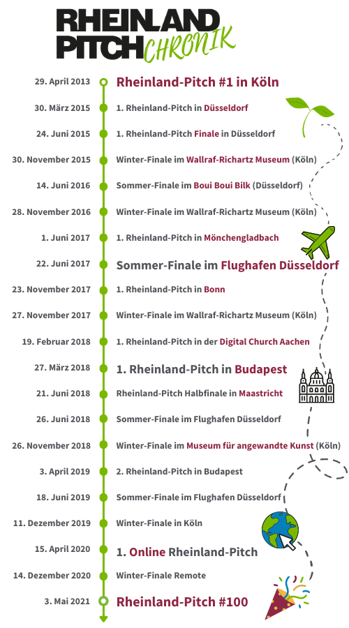 Begonnen hat alles im April 2013 im STARTPLATZ in Köln. Seitdem hat sich viel getan. Mit dem Rheinland-Pitch sind die Größe des Publikums und der Radius, in dem die Pitch-Veranstaltung abgehalten wird, kontinuierlich gewachsen. Wir nehmen euch mit auf Tour und durchlaufen noch einmal gemeinsam die verschiedenen Stationen des Rheinland-Pitch.
