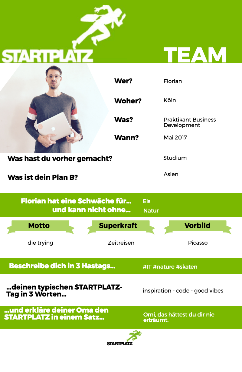 Vielen Dank an Florian, für deine Antworten und deine Arbeit bei STARTPLATZ! Nächste Woche folgt das nächstes S-Team Mitglied, also seid gespannt.