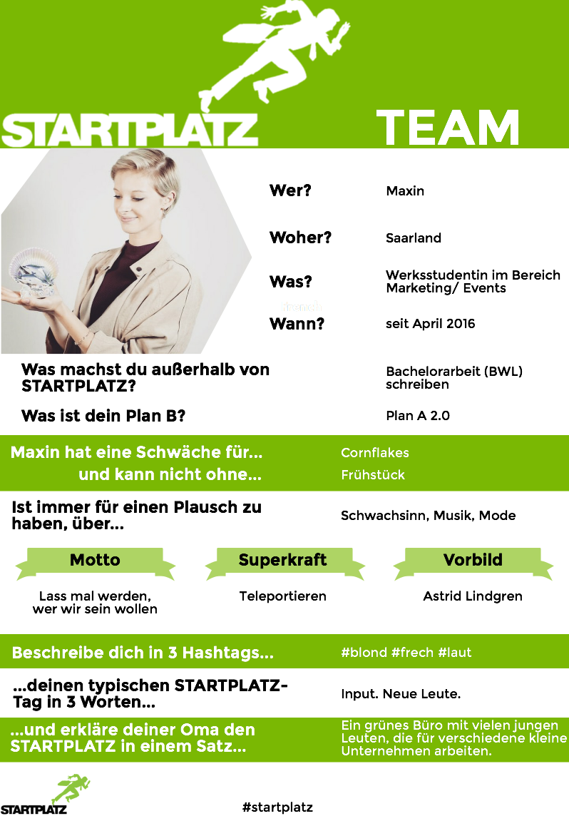 Vielen Dank an Maxin für deine Antworten und deine Arbeit bei STARTPLATZ! Weiter geht’s mit dem nächsten S-Team Mitglied, Victoria.