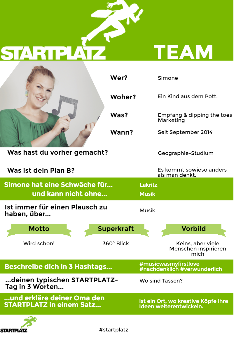 Vielen Dank an Simone für deine Antworten und deine Arbeit bei STARTPLATZ! Nächste Woche folgt das nächste S-Team Mitglied, Johannes, also seid gespannt.