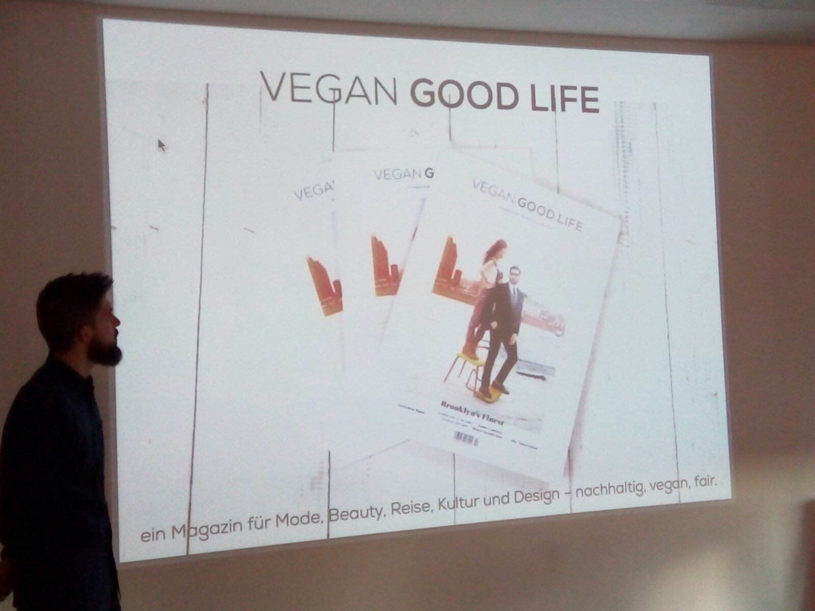 Eröffnet wurde der Vortragsabend von Vegan Good Life. Vegan Good Life ist ein Lifestyle Magazin, das sich zum Ziel gesetzt hat, stylische Produkte, nachhaltigen Konsum und innere Ausgeglichenheit zu vereinen. In dem Vortrag haben das ehemalige Laufsteg-Model Julia Koch und der freie Fotograf und Redakteur Eric Mirbach über die persönlichen Gründe für die Entscheidung zum Veganen Lebensstil berichtet. Am Ende wurde sehr schnell klar: