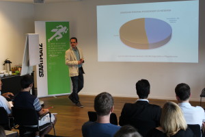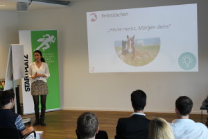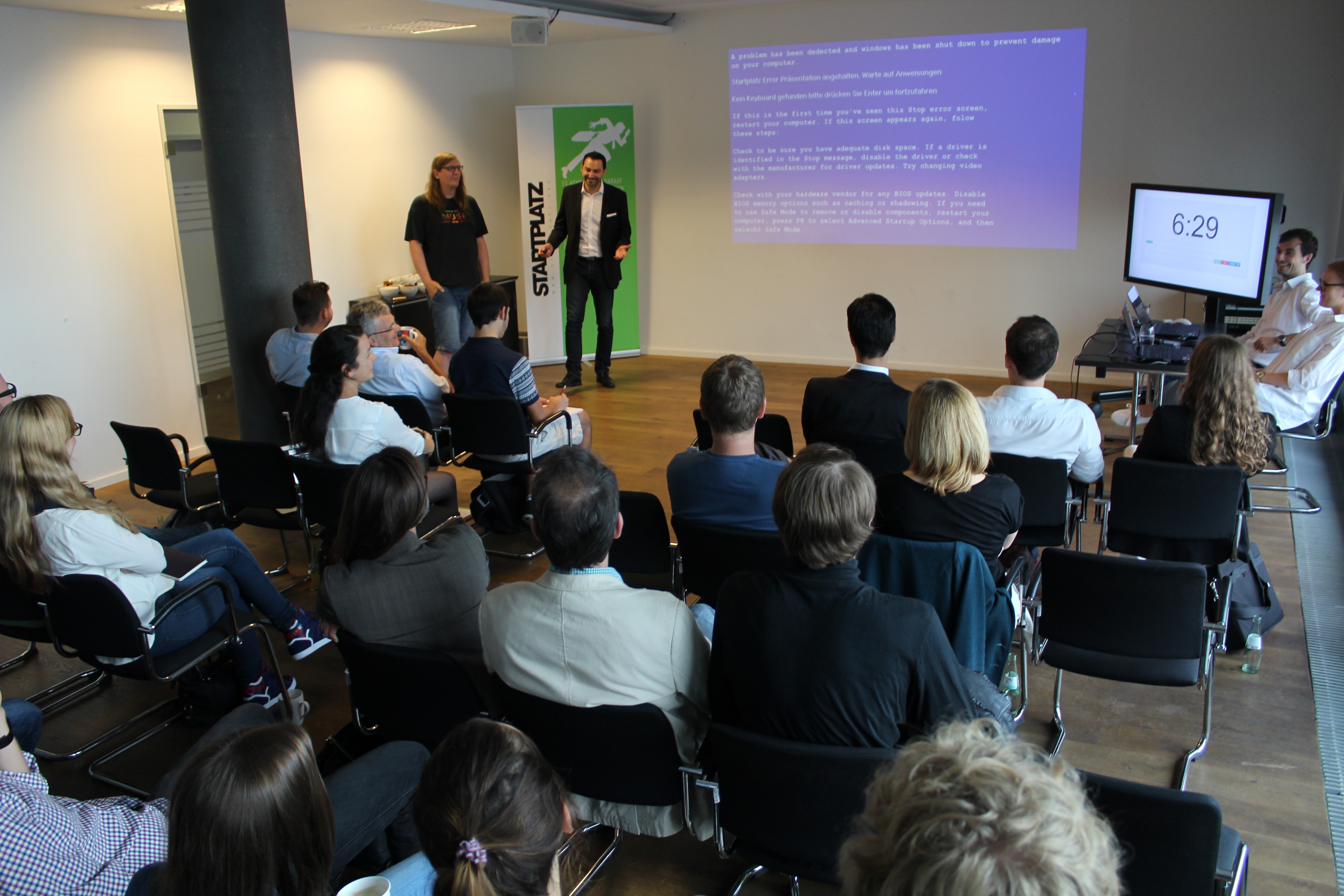 Jetzt, am 04. August, pitchten die Teams ein letztes Mal im Rahmen ihres Stipendiums. In ihren sieben minütigen Pitches stellten die vier Teams Call a Nerd, World of VR, Reitstübchen und Curassist vor, was sie in dieser allzu kurzen Zeit erreicht haben. Im Anschluss zu den Pitches gab es jeweils eine ebenfalls sieben minütige Fragerunde, in der das interessierte Publikum Fragen stellte und den Teams Anreize für die Zukunft gab. Neben der bunten Mischung des Publikums aus Gründern und ehemaligen Stipendiaten, freuten wir uns besonders, Dr. Thilo Schuhmacher, Chiara Fries und Sascha Loux von der AXA Deutschland begrüßen zu dürfen, die bei dieser Stipendiumsrunde erstmals das Gründerstipendium von Thomas Müller (Curassist) förderten und betreuten.