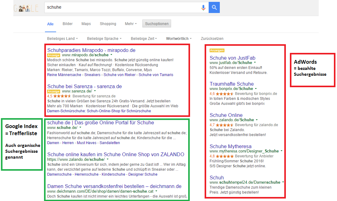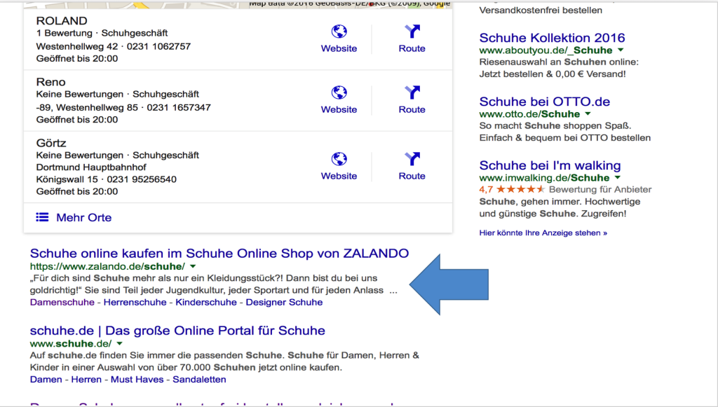 Zalando hat seine Seite so gut optimiert, dass es, trotz großer Schuhvertriebskonkurrenz wie Görtz oder Tamaris, nur bei der Eingabe des Keywords „Schuhe“ schon in der organischen Suche auf der ersten Seite den ersten Platz einnimmt.