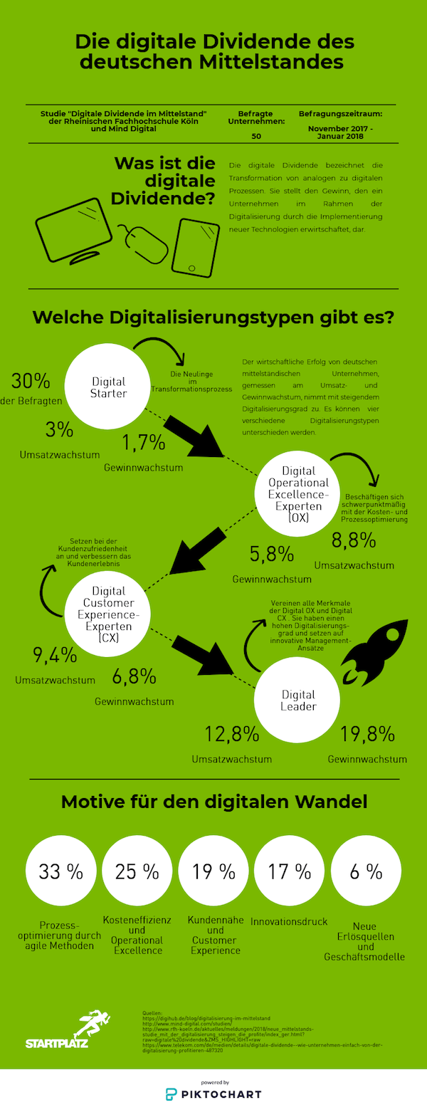 Sind mittelständische Unternehmen in Deutschland der digitalen Transformation gewachsen? Dieser Frage geht die Studie “Digitale Dividende im Mittelstand” der Rheinischen Fachhochschule Köln in Zusammenarbeit mit dem Berater-Netzwerk Mind Digital nach. Einstündige Tiefeninterviews mit Entscheidern aus über 50 mittelständischen Unternehmen unterschiedlichster Branchen dienten als Grundlage der Umfragen, die in der Zeit zwischen November 2017 und Januar 2018 durchgeführt wurden. Das Ergebnis? Erstaunliche Facts und Erkenntnisse, die wir für euch zusammengefasst haben.