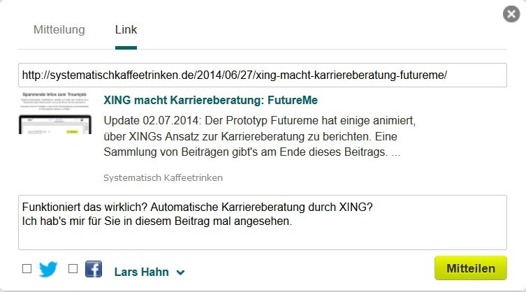Grundsätzlich funktionieren Veränderungen von Profilinformationen bei den direkten Kontakten am besten: neuer Arbeitgeber, neuer Jobtitel, neue Fähigkeiten, abgeschlossenes Studium etc., hier bietet Xing die Möglichkeit sein Netzwerk über die aktuellen Schritte der Karriere upzudaten, ähnlich wie der Beziehungsstatus auf Facebook.